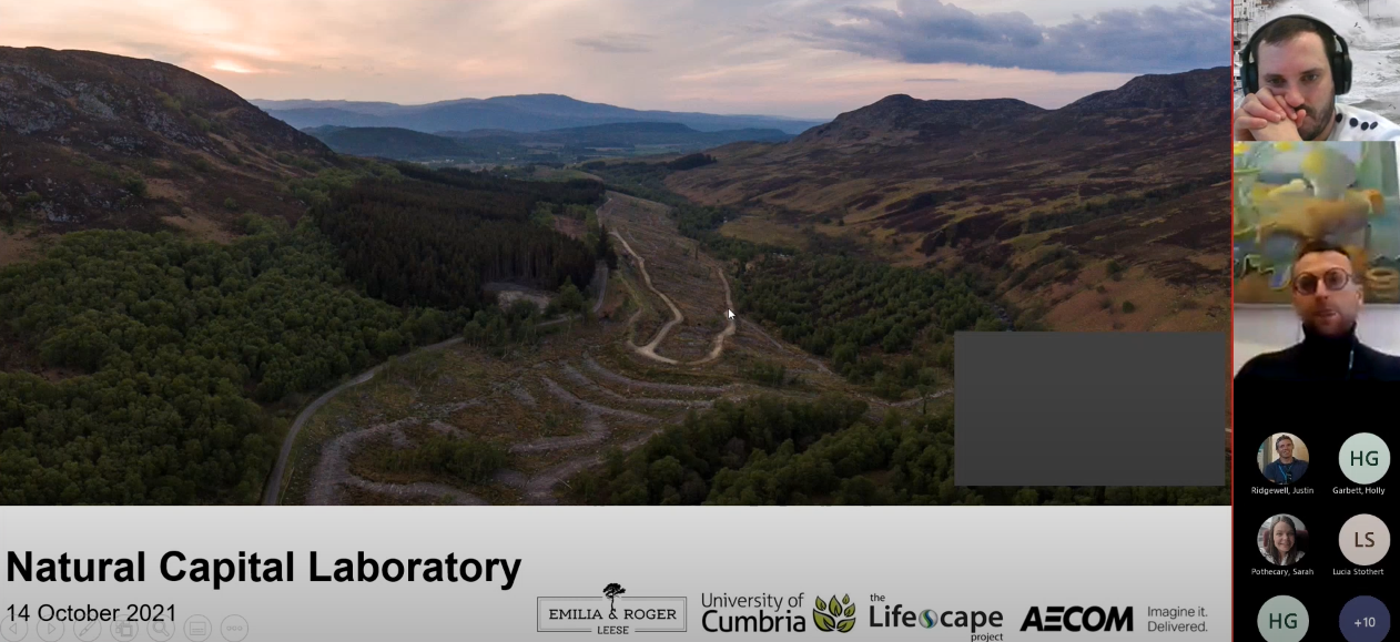 Chris White (AECOM) presented “The Natural Capital Laboratory”. This project is using tools such as drone technology, thermal imaging and Artificial Intelligence (AI) to create a digital twin of a re-wilding site in the Scottish Highlands. Data from these experimental measuring approaches will enable quantification of the costs and benefits of NbS and re-wilding. Key topics of discussion in the breakout room included: